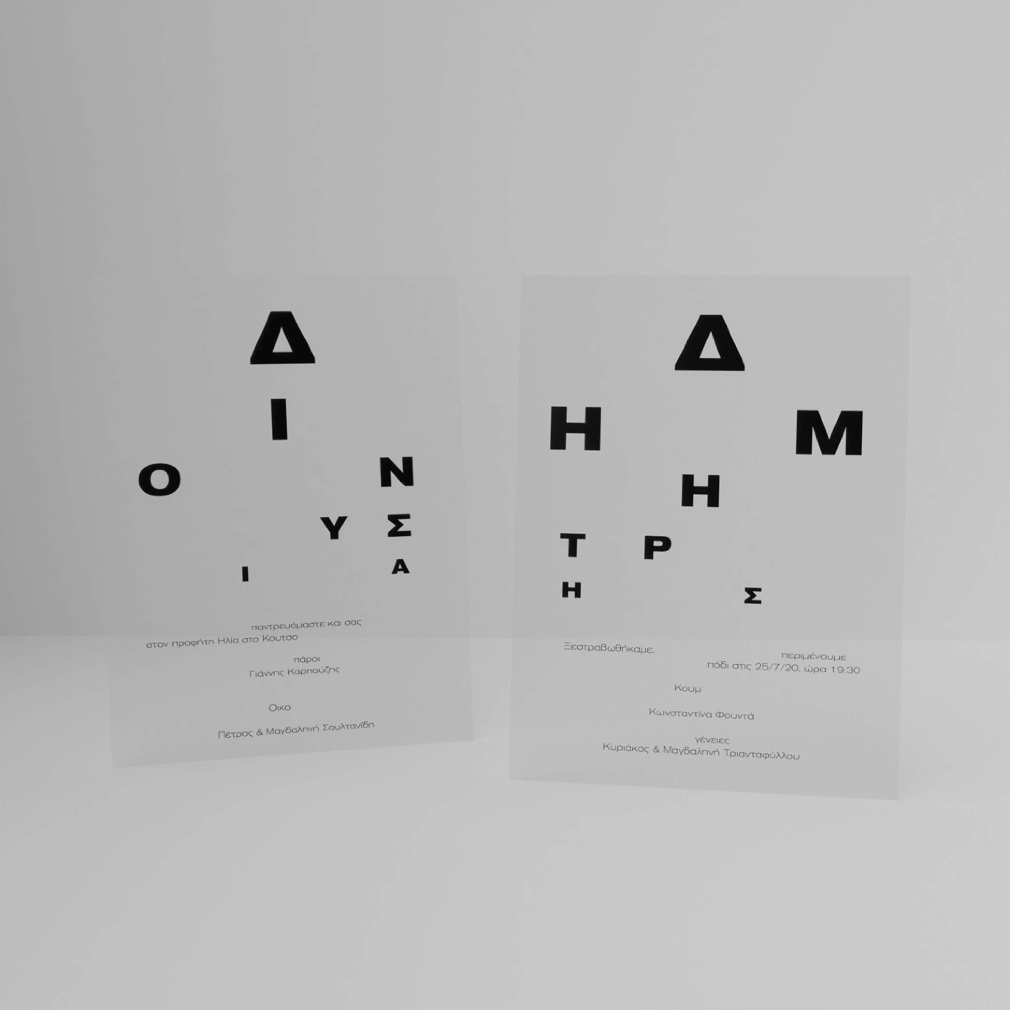 Με αυτή την ιδέα, σχεδιάσαμε το προσκλητήριο-οπτότυπο για τον γάμο τους: ένα παιχνίδι με τα δύο Δ. Το κείμενο του προσκλητηρίου γίνεται ευδιάκριτο μόνο όταν τα Δ ενώνονται, σαν να ξαναβρίσκουν τη σαφήνεια και την αρμονία που τους χαρακτηρίζει.