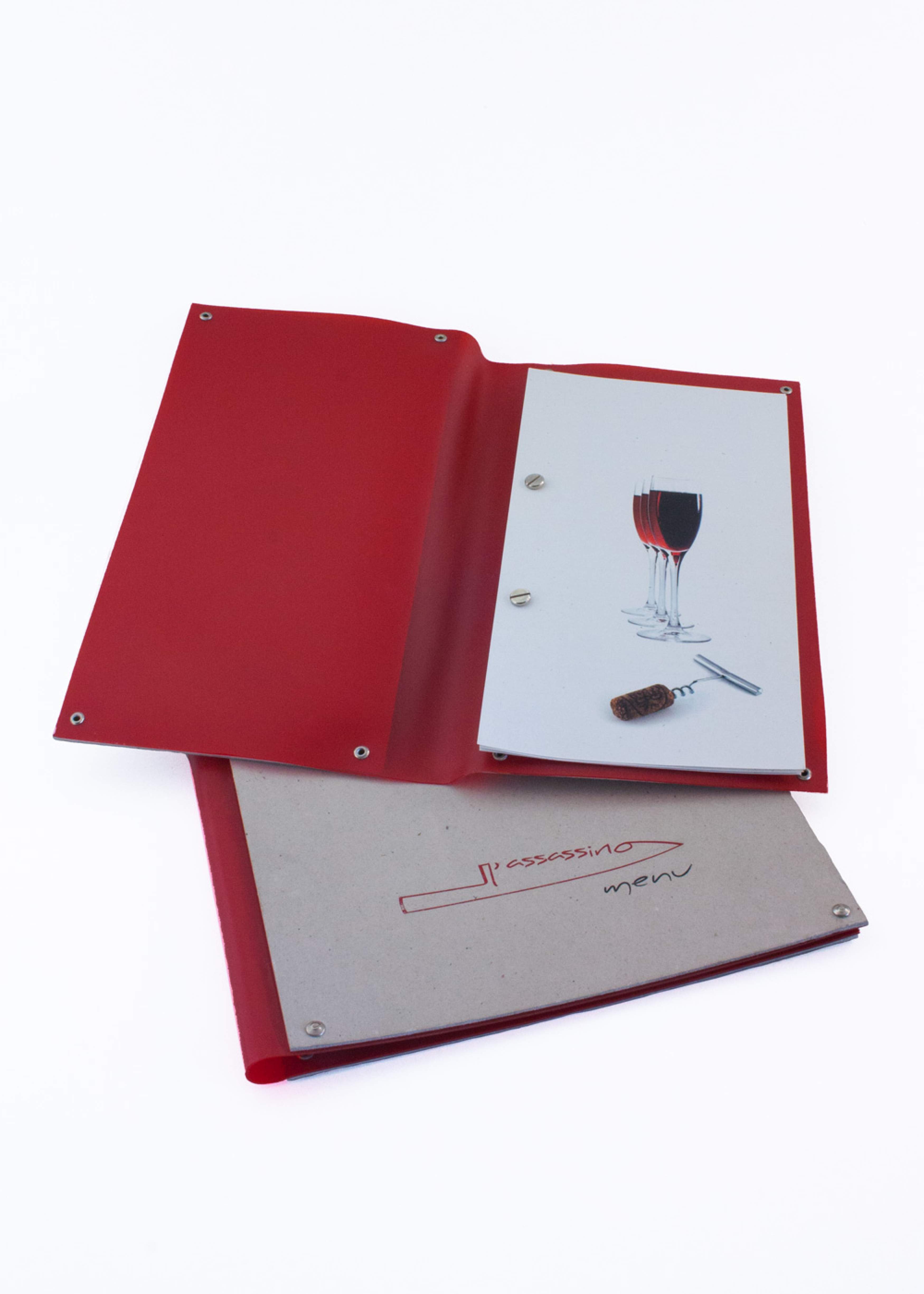 The logo, a bright red chef’s knife, captures this spirit. Simple yet striking, it symbolizes craftsmanship, daring, and a passion for the culinary arts. Even the menu is part of the story. Handmade, it combines bookbinding cardboard, red hot-stamping, and a red plastic cover, fastened with binding screws. Every detail exudes care, skill, and a touch of theatricality.