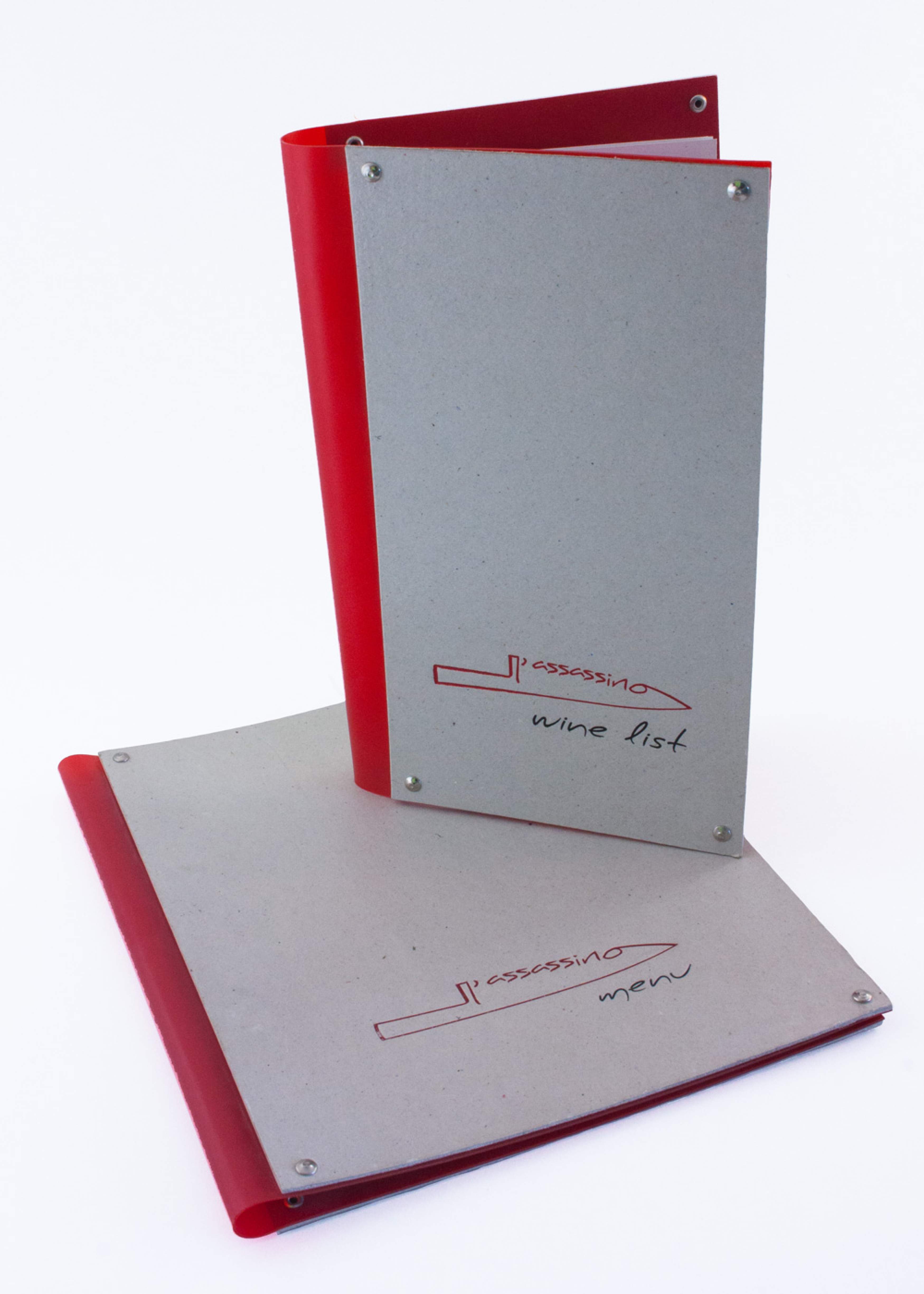 Το λογότυπο, ένα κατακόκκινο μαχαίρι σεφ, αποτυπώνει όλο αυτό το πνεύμα. Απλό αλλά εντυπωσιακό, αποτελεί σύμβολο δεξιοτεχνίας, τόλμης και πάθους για τη γαστρονομική τέχνη. Ακόμη και το μενού είναι μέρος της ιστορίας. Χειροποίητο, συνδυάζει χαρτόνι βιβλιοδεσίας, κόκκινη θερμοτυπία και κόκκινο πλαστικό εξώφυλλο, στερεωμένο με βίδες βιβλιοδεσίας. Κάθε λεπτομέρεια αποπνέει φροντίδα, δεξιοτεχνία και μια δόση θεατρικότητας.