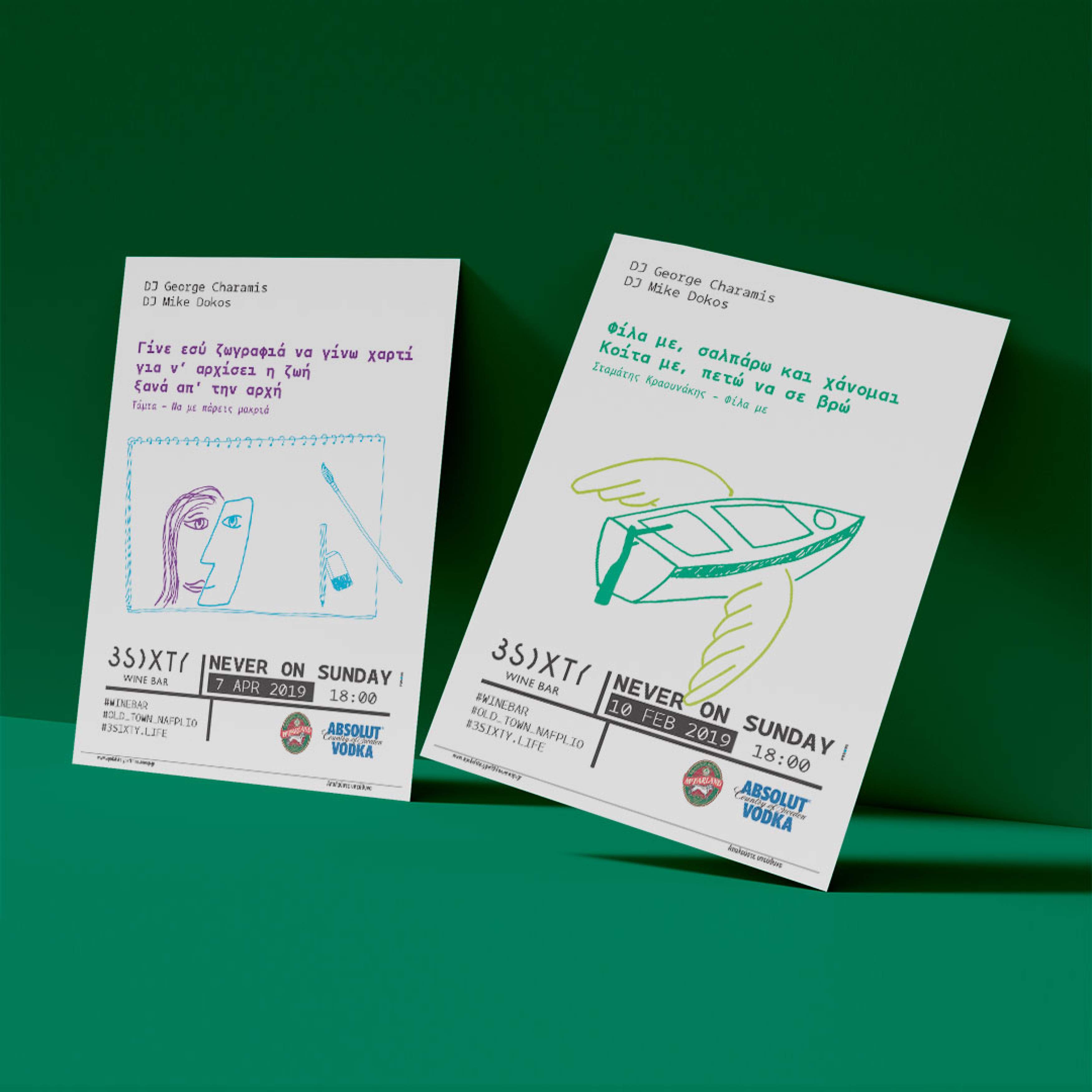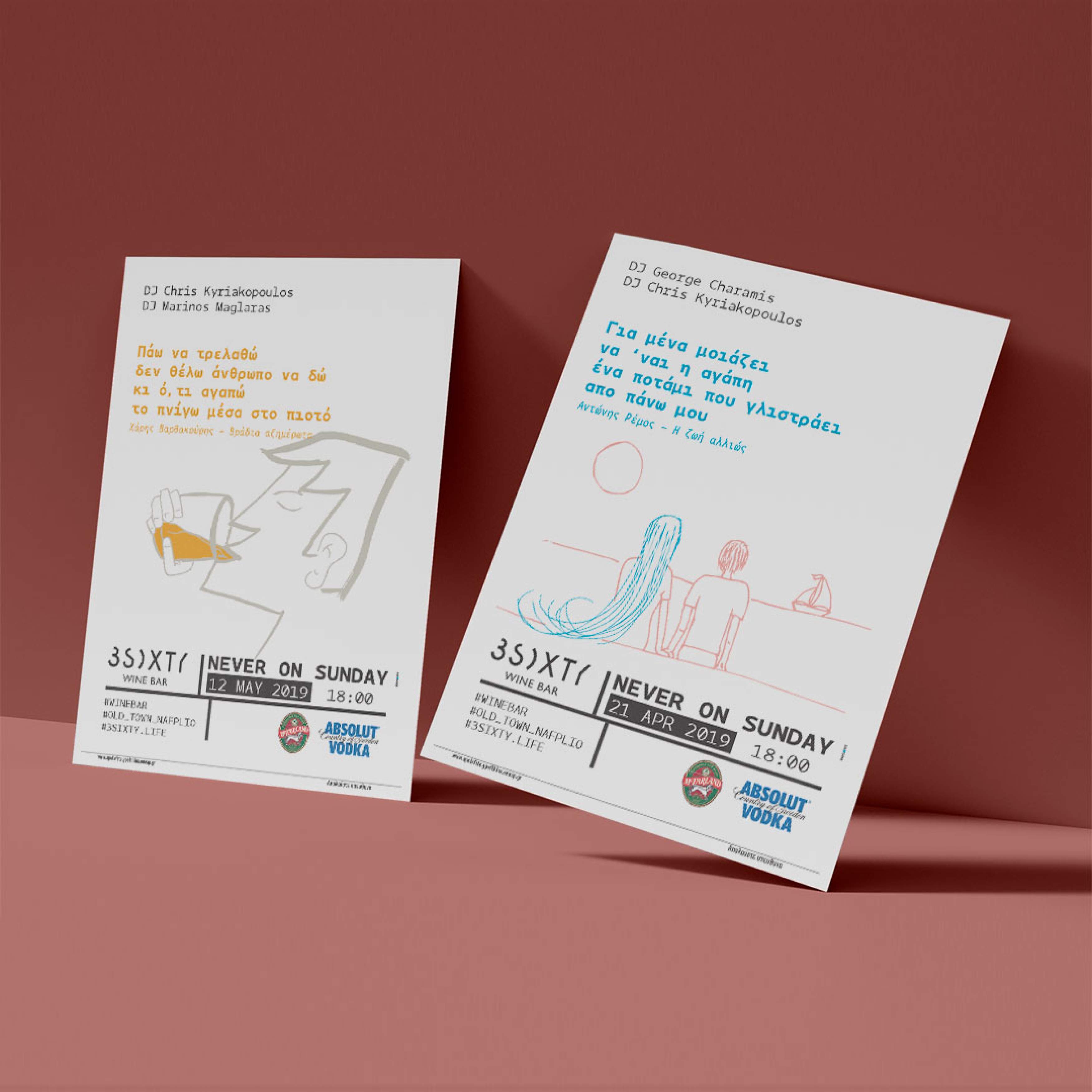 Με αυτόν τον τρόπο, οι αφίσες έγιναν όχι μόνο εργαλείο προβολής, αλλά και μέρος της ίδιας της εμπειρίας του πάρτυ, κάνοντας το Never on Sunday να ξεχωρίζει και να αποκτά συλλεκτικό χαρακτήρα.