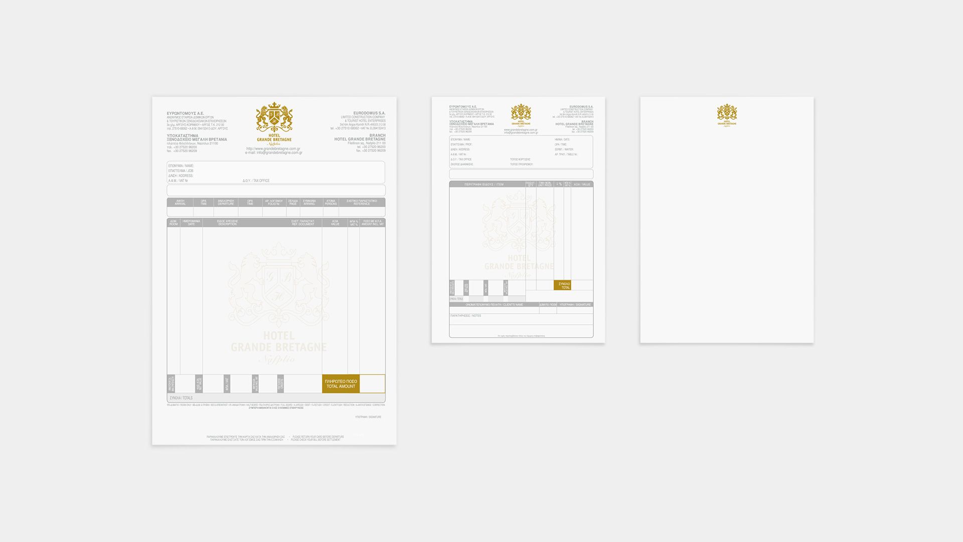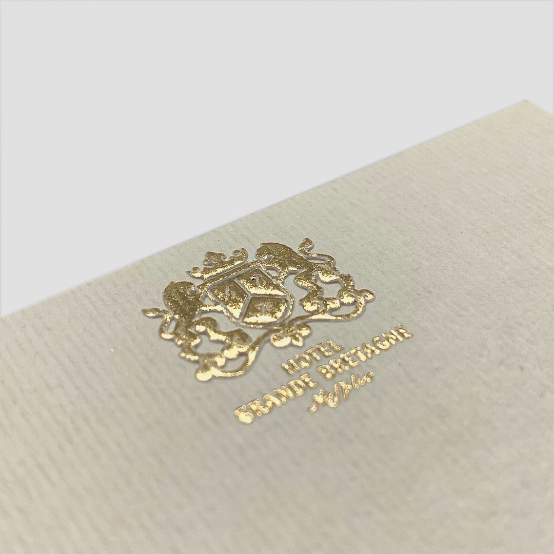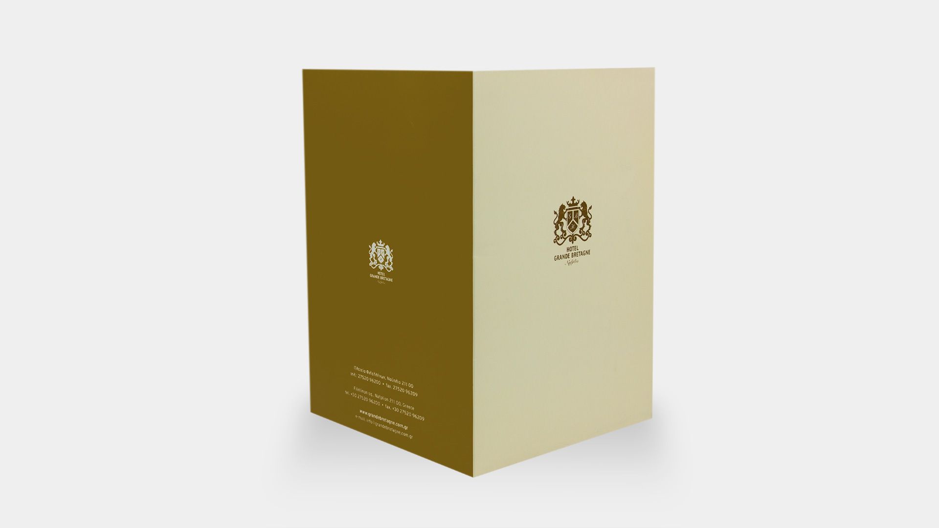 In the heart of Nafplio’s old town, within a building rich in Venetian aesthetics, history meets modern luxury. The current Grande Bretagne hotel occupies a space that once hosted a tavern, and even earlier, a hotel with the same historic name. During our research, we discovered old letterheads, faintly bearing a coat of arms. This inspired the design of the hotel’s current logo: the coat of arms is rendered with gold foiling and embossed details, conveying the prestige and timeless elegance of the name.