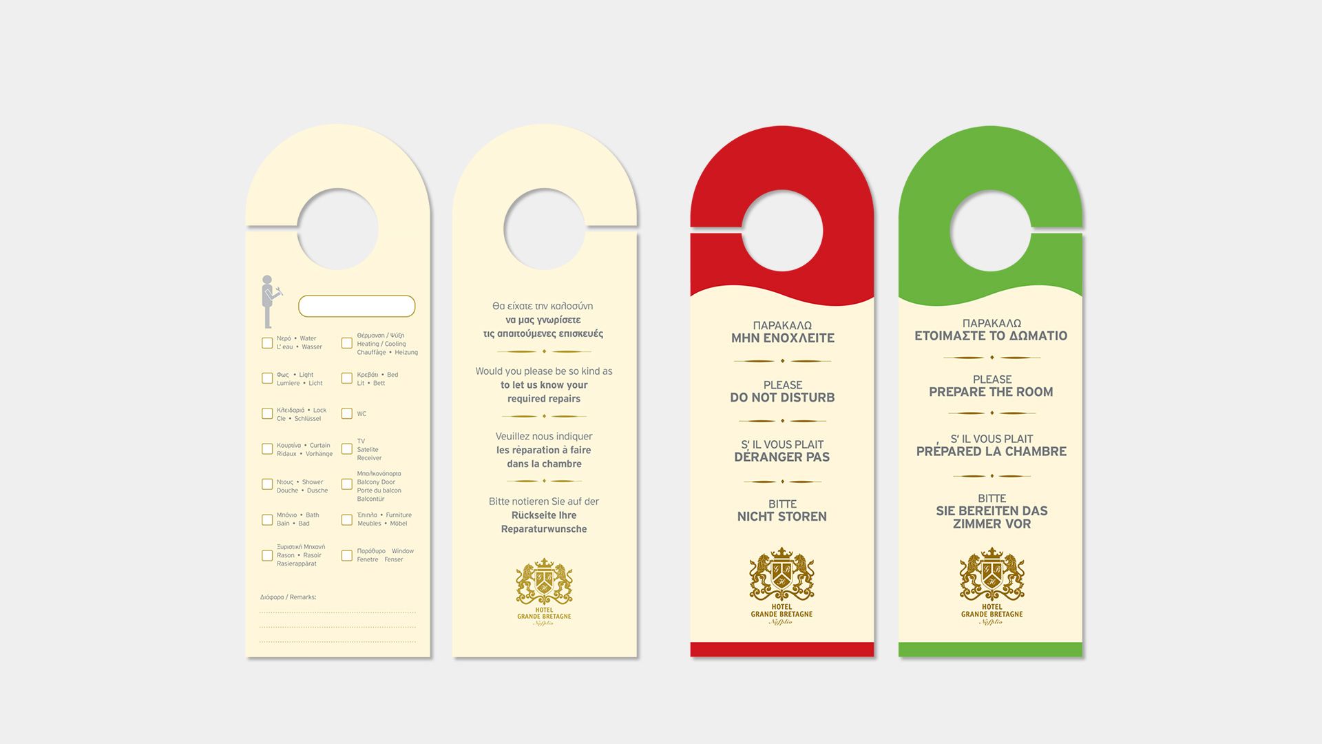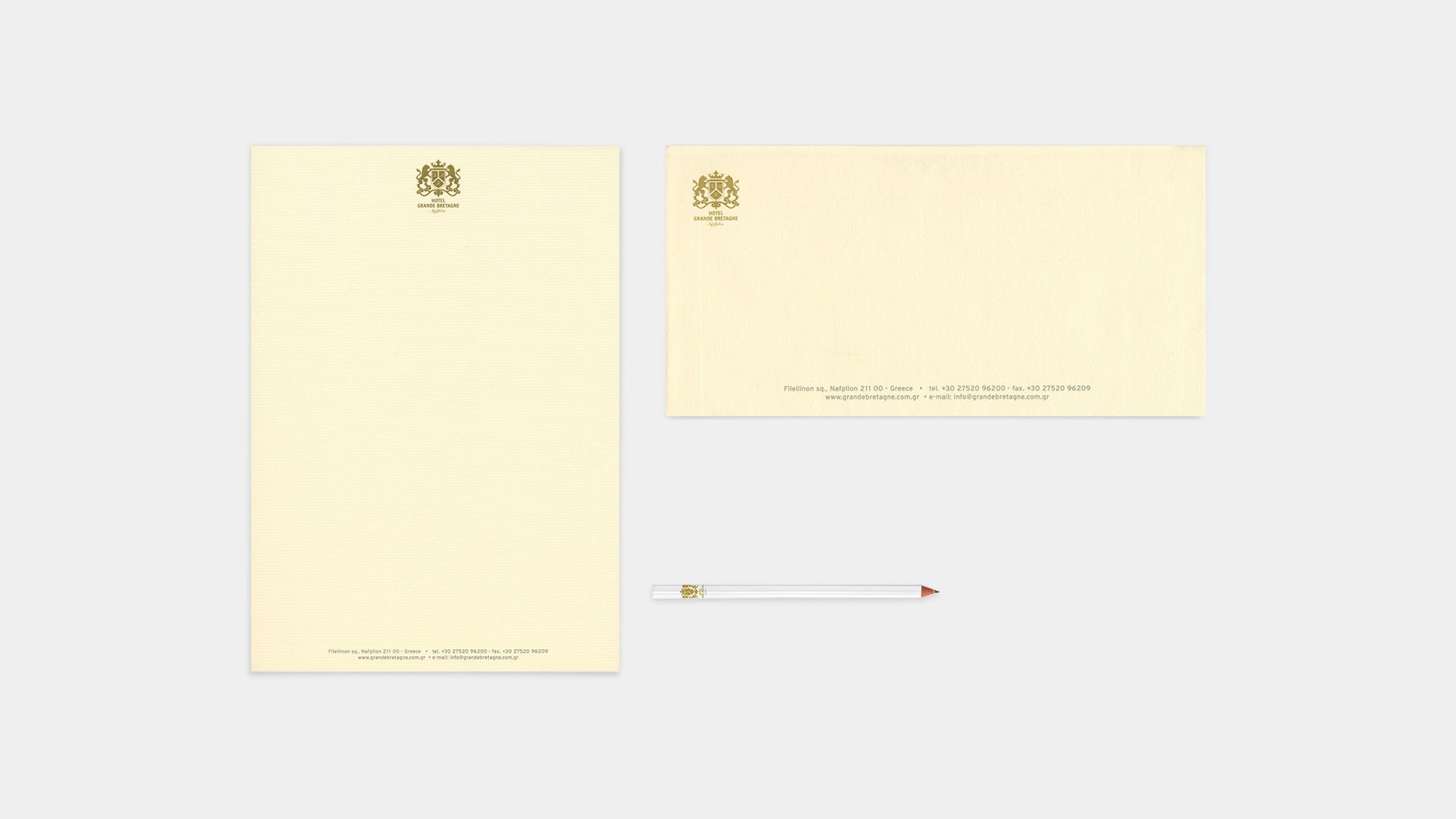 Στην καρδιά της παλιάς πόλης του Ναυπλίου, μέσα σε ένα κτίριο με έντονη ενετική αισθητική, η ιστορία συναντά τη σύγχρονη πολυτέλεια. Το σημερινό ξενοδοχείο Grande Bretagne βρίσκεται σε χώρο που άλλοτε φιλοξενούσε ταβέρνα και, αρκετά χρόνια πριν, πάλι ξενοδοχείο με το ίδιο όνομα. Κατά την έρευνά μας ανακαλύψαμε παλιά επιστολόχαρτα, όπου διακρινόταν αμυδρά ένας θυρεός. Αυτό αποτέλεσε την έμπνευση για τον σχεδιασμό του σημερινού λογοτύπου: ο θυρεός αποτυπώνεται με χρυσοτυπία κι ανάγλυφα στοιχεία, αποδίδοντας το κύρος και τη διαχρονική κομψότητα του ονόματος.