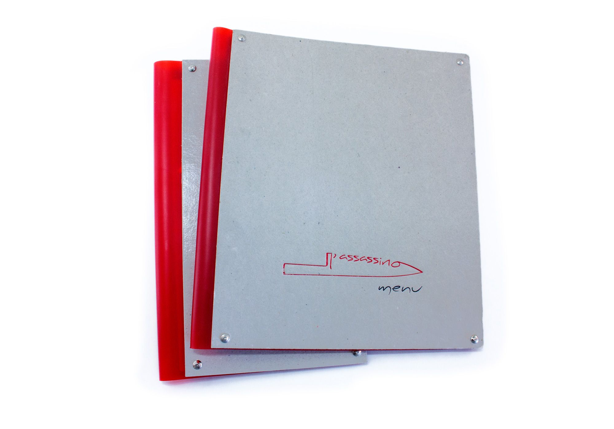 The logo, a bright red chef’s knife, captures this spirit. Simple yet striking, it symbolizes craftsmanship, daring, and a passion for the culinary arts. Even the menu is part of the story. Handmade, it combines bookbinding cardboard, red hot-stamping, and a red plastic cover, fastened with binding screws. Every detail exudes care, skill, and a touch of theatricality.